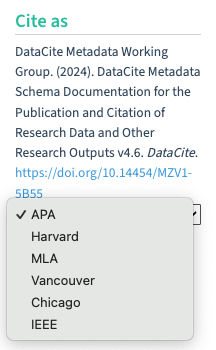 On DataCite Commons Work pages, the "Cite as" section displays a formatted citation for the DOI. Use the dropdown menu to select different citation styles: